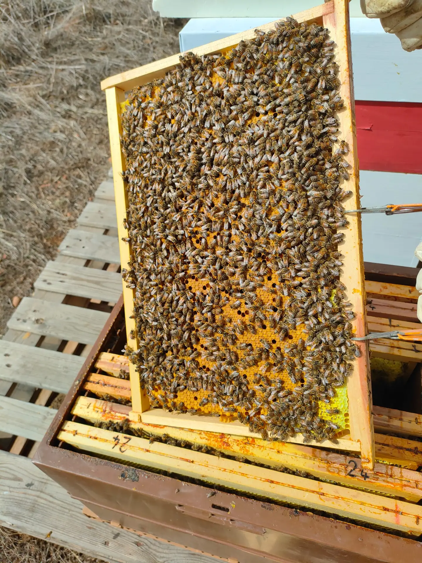 Essaim d’abeilles hiverné sur 6 cadres avec reine fécondée F1 – Disponible début avril 2026 selon les conditions climatiques.